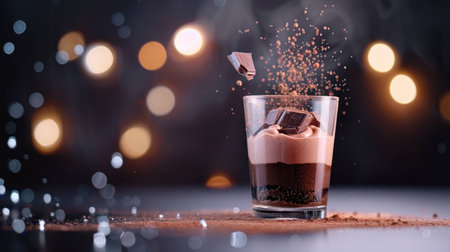 A stunning presentation of a rich chocolate dessert in a glass, topped with creamy layers, floating chocolate pieces, and a bokeh background that enhances the visual delight.