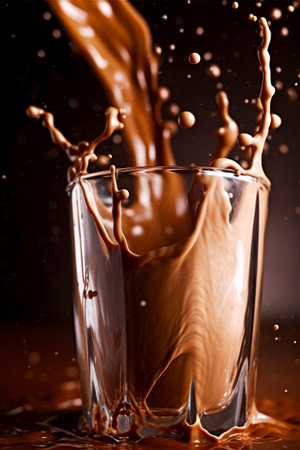 Glass filled with chocolate liquid on top of brown counter top with drops of liquid coming out of the top of the glass. Generative AI.