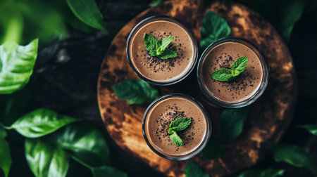 AI Generated. A close up of four glasses of a brown drink with chocolate chips