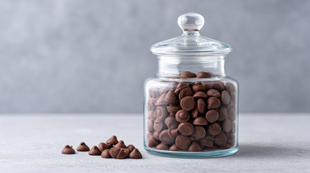 A beautifully arranged glass jar filled with chocolate chips sits against a soft gray background, perfect for enhancing baking creations and desserts.
