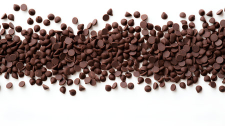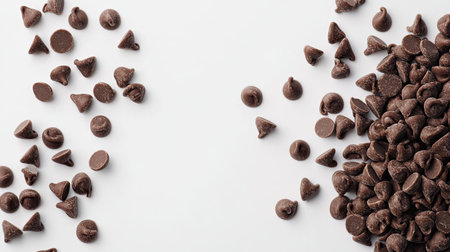 Chocolate chips scattered on a clean white background with ample negative space.
