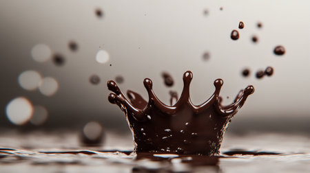 Rich chocolate forms an intricate crown shape as it splashes against a smooth surface. Soft lighting enhances the glossy texture, creating an enticing and artistic visual effect.