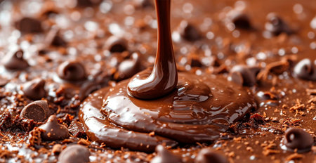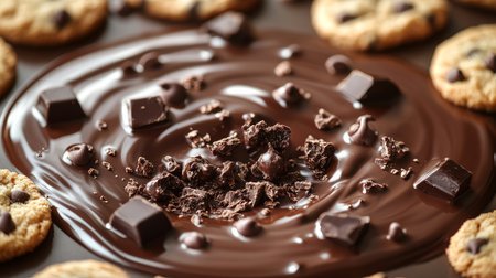 Explore the allure of silky melted chocolate, featuring rich textures and chunks, ideal for dessert-themed projects and culinary delights. Perfect for food photography.