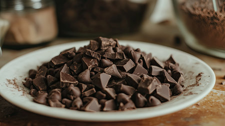 A closeup of dark chocolate chips artistically arranged on a white plate, set in a rustic kitchen. Ideal for food lovers, bakers, or culinary projects.