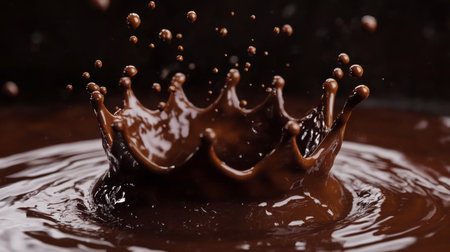 Close-up of chocolate splash creating crown shape in liquid, dark background. Indulgent dessert and culinary art concept