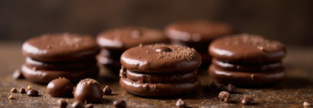 Chocolate cookies covered with chocolate icing and sprinkles are creating a delicious banner with copy space on a wooden table, perfect for showcasing your product or message