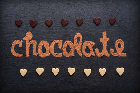 Text made of cocoa powder Chocolate on slate blackboard