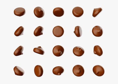 Round Chocolate Chips Falling on white isolated floor 3d illustration