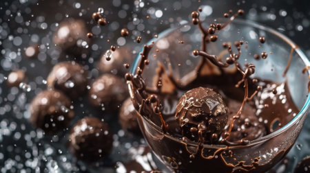 Close-up shot of chocolate truffles splashing into a bowl of melted dark chocolate, capturing the dynamic movement and rich texture.