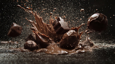 A dramatic shot of chocolate splashing, with truffles and a chocolate bar suspended in motion, creating an indulgent and rich visual of the sweet treat in mid-action.