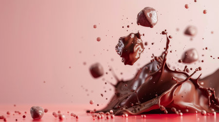 Dynamic chocolate splash with liquid droplets captured mid-air on a soft pink background, creating an artistic effect.