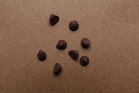 Delicious chocolate chips on brown background, top view