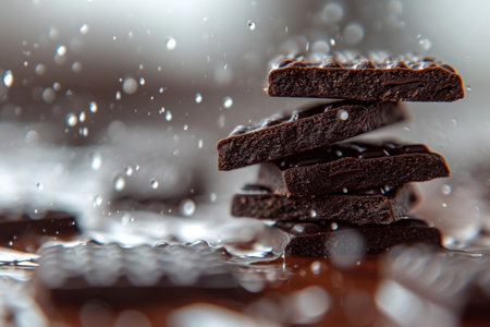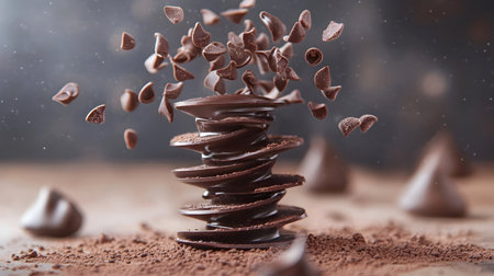 Dynamic stack of dark chocolate pieces with floating chocolate chips, creating a surreal explosion of cocoa flavors.