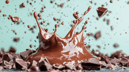 Rich and Decadent Chocolate Splash Surrounded by Chunks with Soft Focus Background for Culinary, Dessert, and Food Photography Needs