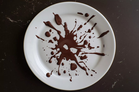 A burst of chocolate splatters contrasts beautifully against a clean white plate, showcasing an artistic flair.