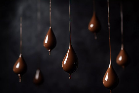 Delicate strands of melted chocolate hang in the air against a dark backdrop, creating an enchanting atmosphere. Each droplet captures light, emphasizing its rich texture and indulgent allure.