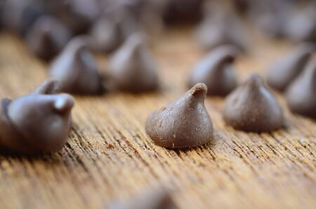 Many chocolate chips are on gray abstract background. Background with chocolate. Slices of chocolate Sweet food photo concept. Copyspace