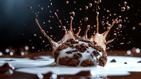 A chocolate cookie dropping into a pool of milk, sending up splashes of both milk and tiny chocolate crumbs, with dramatic lighting.
