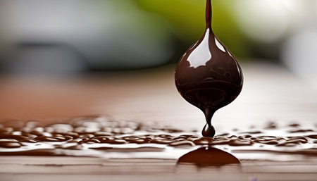 Macro shot of a chocolate drip forming a delicate drop, highlighted against a blurred green background.. AI Generation