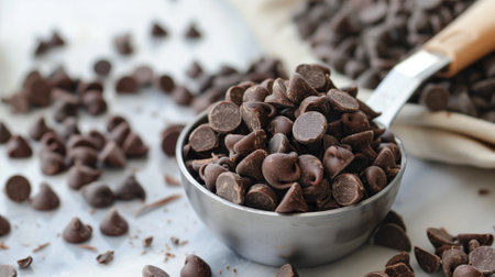 Metal scoop full of chocolate chips in bowl with more scattered around