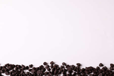 Chocolates chips on a table on white background, closeup. World Chocolate Day. Delicious dessert, banner background.
