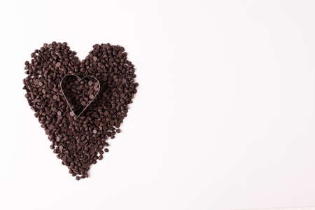 Overhead view of heart shape pastry cutter on chocolate chips by copy space over white background. unaltered, sweet food and unhealthy eating concept.