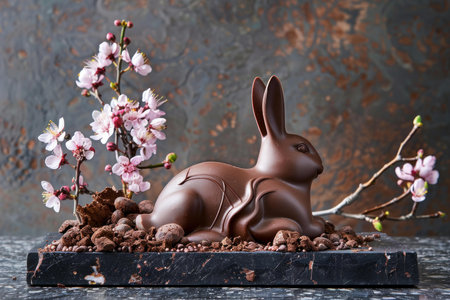 Milk chocolate easter bunny surrounded by springtime cherry blossoms
