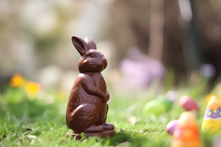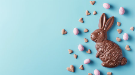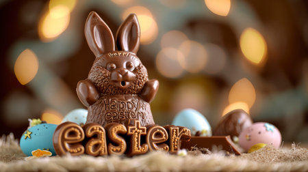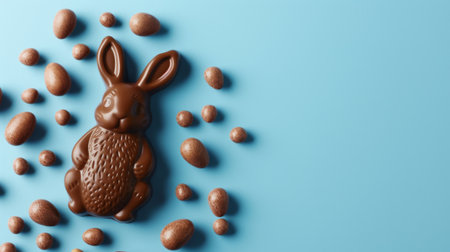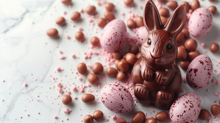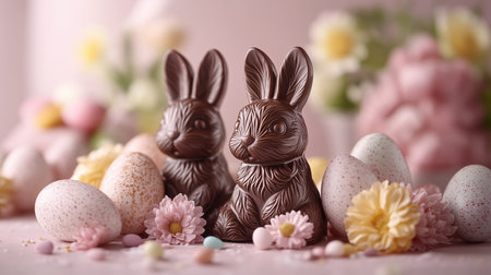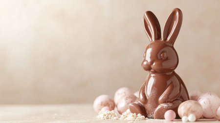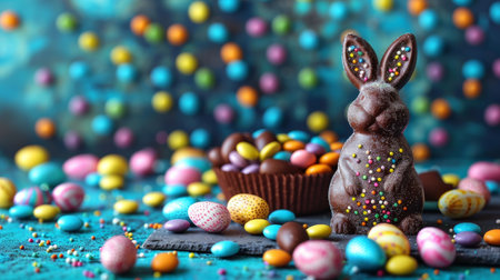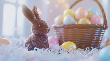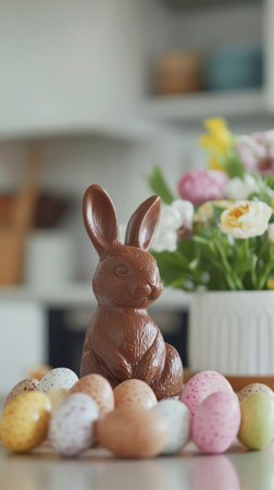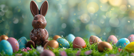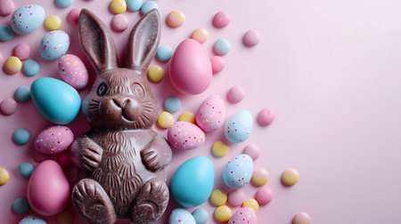 This charming image features a delightful chocolate bunny surrounded by pastel decorative eggs, perfect for Easter or any festive occasion.
