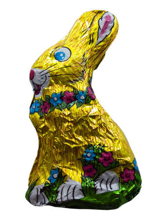 Photo of a tinfoil covered chocolate easter bunny isolated on white