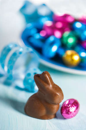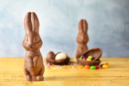 Delicious Easter holiday chocolate bunny, eggs and sweets