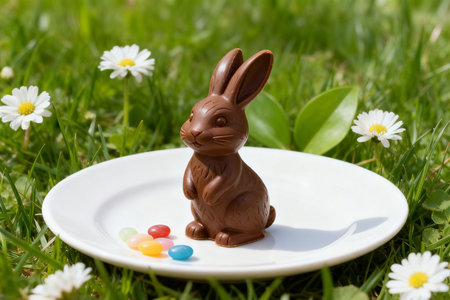 Chocolate bunny sitting on a plate with fresh spring flowers on a table