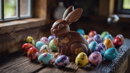 Chocolate Easter bunny surrounded by colorful decorated eggs on a rustic wooden table near a window, celebrating Easter traditions.