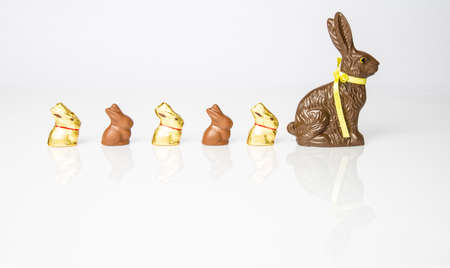 Large Chocolate Easter bunny with smaller chocolate bunnies lined up in a row. Studio Isolated on white with reflection. Part of a Series.