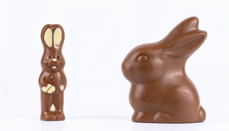 Two chocolate Easter bunnies, one standing and one sitting, on a white background.