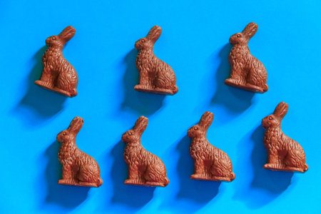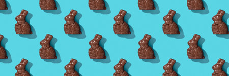 Chocolate Easter Bunny on blue background pattern, flat lay