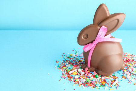 Chocolate Easter bunny and sprinkles on light blue background. Space for text