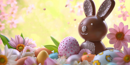 Chocolate Easter Bunny with Painted Eggs Among Spring Flowers