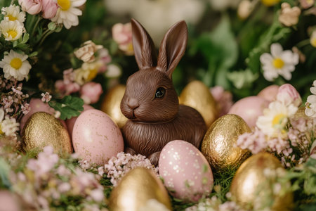 Charming spring display featuring a chocolate bunny surrounded by golden and pink easter eggs