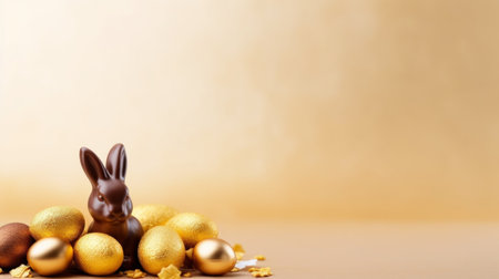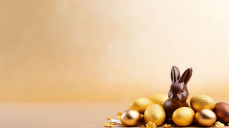 Beautiful minimalistic Easter background with chocolate bunny and golden Easter eggs with large copyspace area.