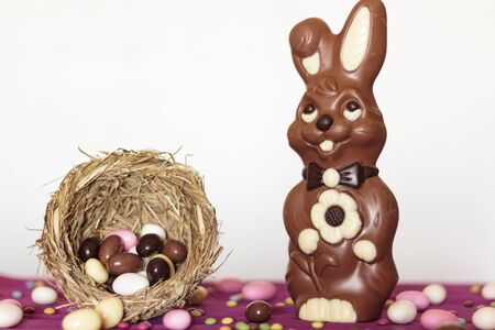 Chocolate bunny and nest with easter almond eggs on table with white background