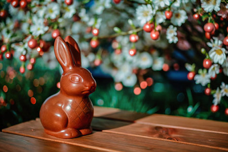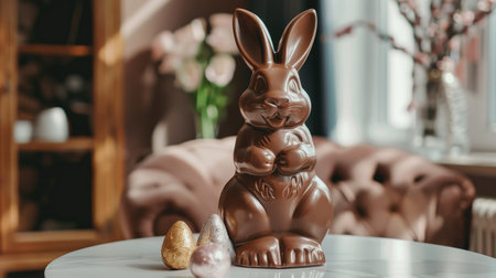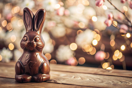 Chocolate Bunny on a Table Festive Easter Decor and Blurred Spring Flowers in Background