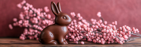 Chocolate Easter Bunny and Pink Berries Festive Springtime Still Life on Rustic Wood