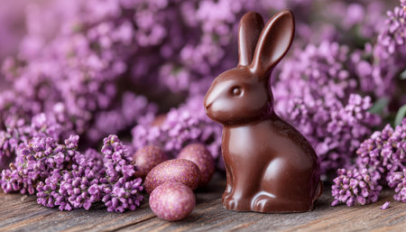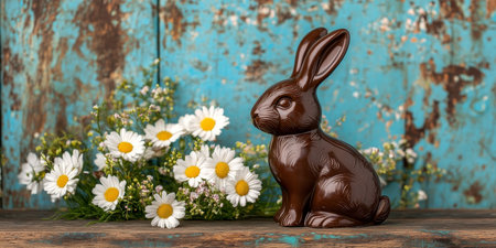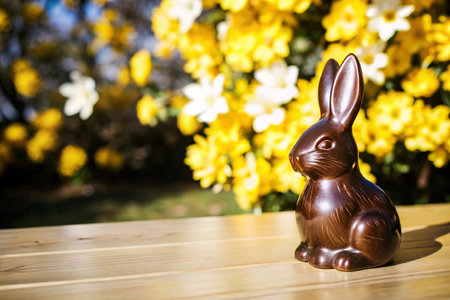 Chocolate Easter Bunny on a Rustic Wooden Table, With Spring Flowers in the Background