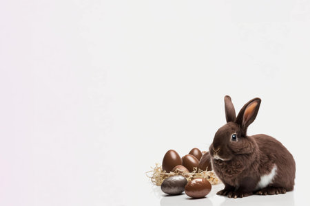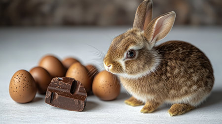A fluffy brown rabbit sits near chocolate eggs, creating a festive spring atmosphere.