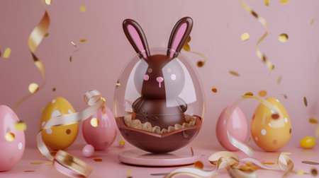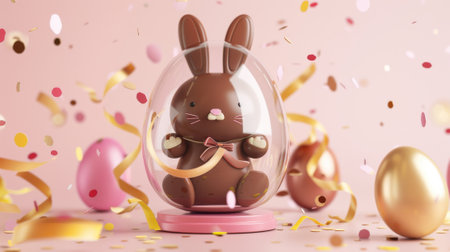 An illustrated chocolate bunny with a transparent eggshell base, decorated with ribbons, painted Easter eggs, and gold confetti on a light pink background.
