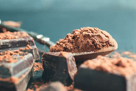 Brown cocoa powder in the spoon and chopped chocolate cubes on dark background with copy space.