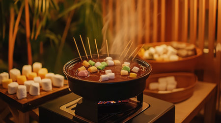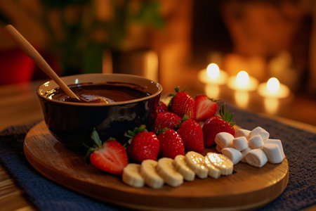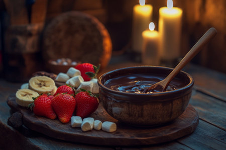 A delectable spread of chocolate fondue with strawberries and marshmallows, perfect for gatherings that celebrate fun, flavor, and togetherness in a cozy atmosphere.