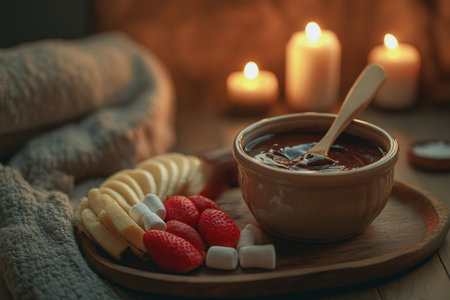 Chocolate fondue with marshmallows, fresh strawberries and candles in spa salon