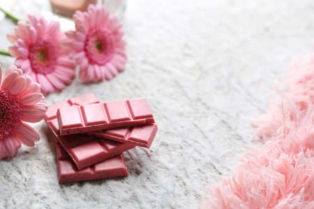 Gourmet ruby chocolate pieces scattered with edible flowers on a pastel cream background, styled minimally.