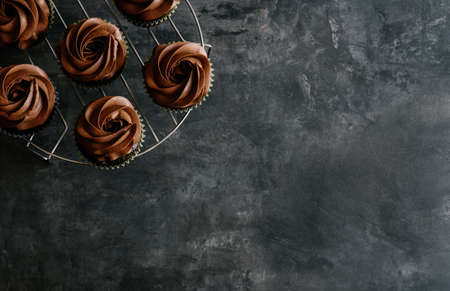 Dark chocolate cupcakes and cocoa nibs on dark background. Sweet food concept.